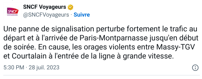 Pierre parti dans le train direction Bordeaux de 16h03 a été immobilisé une heure. « Pas mal de trains étaient coincés devant ». La SNCF a évoqué un « problème d’alimentation, expliquant que la foudre a touché les installations ». Son TGV vient « de repartir à vitesse très réduite », un retard de 1h15 lui est désormais annoncé.